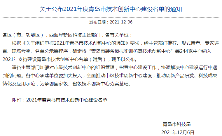 2021年12月6日,青島市科技局公示了2021年度技術(shù)創(chuàng)新中心建設名單,青島正亞機械科技有限公司在眾多參選企業(yè)中脫穎而出,成功入選。