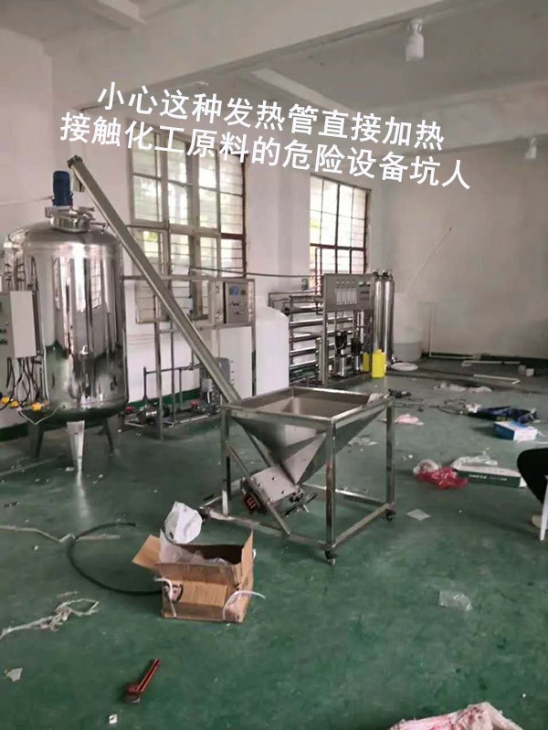 廣大客戶朋友應(yīng)當(dāng)小心上圖這種洗潔精設(shè)備內(nèi)部直接加熱的薄皮偽劣設(shè)備,這種設(shè)備內(nèi)部安裝的直接接觸化工原料的發(fā)熱管,容易因為化工原料腐蝕導(dǎo)電引發(fā)人身安全事故。這類騙子最大特點,一沒有環(huán)評資質(zhì),二是設(shè)備類似薄皮棺材低價銷售。之所以這類騙子有市場,是因為有大部分用戶貪圖便宜被一葉障目。