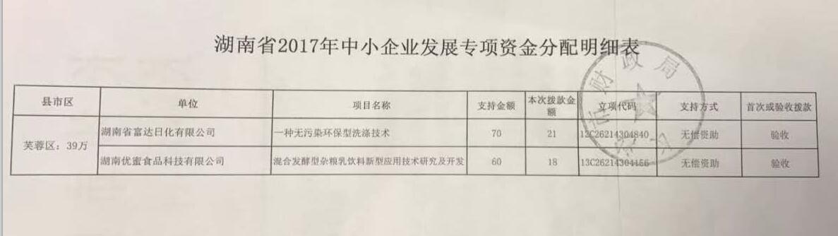 多項(xiàng)專利發(fā)明人王先軍 手機(jī):150-7483-5702 手機(jī):195-7316-02882017年7月26日,根據(jù)湖南省財(cái)政廳關(guān)于下達(dá)2017年中央財(cái)政中小企業(yè)發(fā)展專項(xiàng)資金的通知》(湘財(cái)教指【2017】31號(hào)),將中央財(cái)政中小企業(yè)發(fā)展專項(xiàng)資金予以下達(dá)。由長(zhǎng)沙市財(cái)政局和長(zhǎng)沙市科學(xué)技術(shù)局共同簽發(fā)文件,將相關(guān)款項(xiàng)如數(shù)劃撥到項(xiàng)目承接單位。湖南省富達(dá)日化有限公司申報(bào)的項(xiàng)目“ 一種無(wú)污染環(huán)保洗滌技術(shù)”由中央財(cái)政無(wú)償資助項(xiàng)目項(xiàng)目驗(yàn)收款21萬(wàn)元。截止2017年11月,湖南省富達(dá)日化有限公司再次獲得中央財(cái)政無(wú)償項(xiàng)目資金支持。