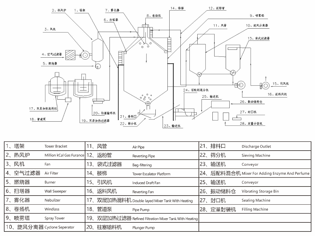 干燥塔(干燥塔體、塔承載加強圈、骨架、熱風(fēng)分布器、人孔檢修門、出風(fēng)管及清洗人孔、錐體氣錘、主塔支撐鋼架、進(jìn)塔熱風(fēng)管道、變徑連接管道、保溫材料、伴熱攪拌罐、電加熱、過濾器)、熱源系統(tǒng)(燃?xì)鉄犸L(fēng)爐)、鼓風(fēng)機(鼓風(fēng)機、初/中效空氣過濾器)、進(jìn)料泵、噴槍、高效旋風(fēng)分離器(高效旋風(fēng)分離器、旋風(fēng)出料閥、緩存料倉)、除塵系統(tǒng)(管道、布袋除塵器)、引風(fēng)機、控制系統(tǒng)(控制柜、變頻器、溫度傳感器、壓力傳感器)、輔助系統(tǒng)(欄桿、扶梯、現(xiàn)場電線電纜橋架、現(xiàn)場鋼架結(jié)構(gòu)平臺) |
