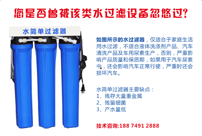 多項專利發(fā)明人王先軍 手機:150-7483-5702 手機:195-7316-0288水處理品種繁多,有如圖所示的簡單過濾式,也有正規(guī)反滲透水處理設備,前者只能過濾水中的常規(guī)雜質(zhì),后者可以去除水中的重金屬離子,還可以殺滅水中的大腸桿菌、芽孢菌。綠農(nóng)桿菌等細菌,從而提高產(chǎn)品去污力,延長產(chǎn)品保質(zhì)期,前者簡單水過濾設備只適合散裝大桶洗滌劑生產(chǎn),后者水處理形成的去離子水可以生產(chǎn)保質(zhì)期長的瓶裝洗滌產(chǎn)品。